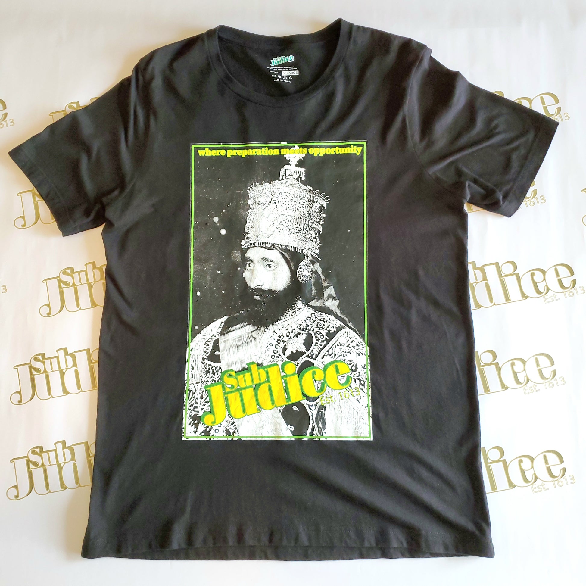 Emperor Haile Selassie I (1892-1975) is one of the most famous leaders in Ethiopian history. He was exiled during the Italian occupation of Ethiopia in 1935, and returned 5yrs later to take back control of his country. Rastafarians believe in the Judeo-Christian god and they call him "JAH" the black messiah and second coming of Christ. SUBJUDICE IS PROUD TO OFFER THESE EXCLUSIVE PIECES.